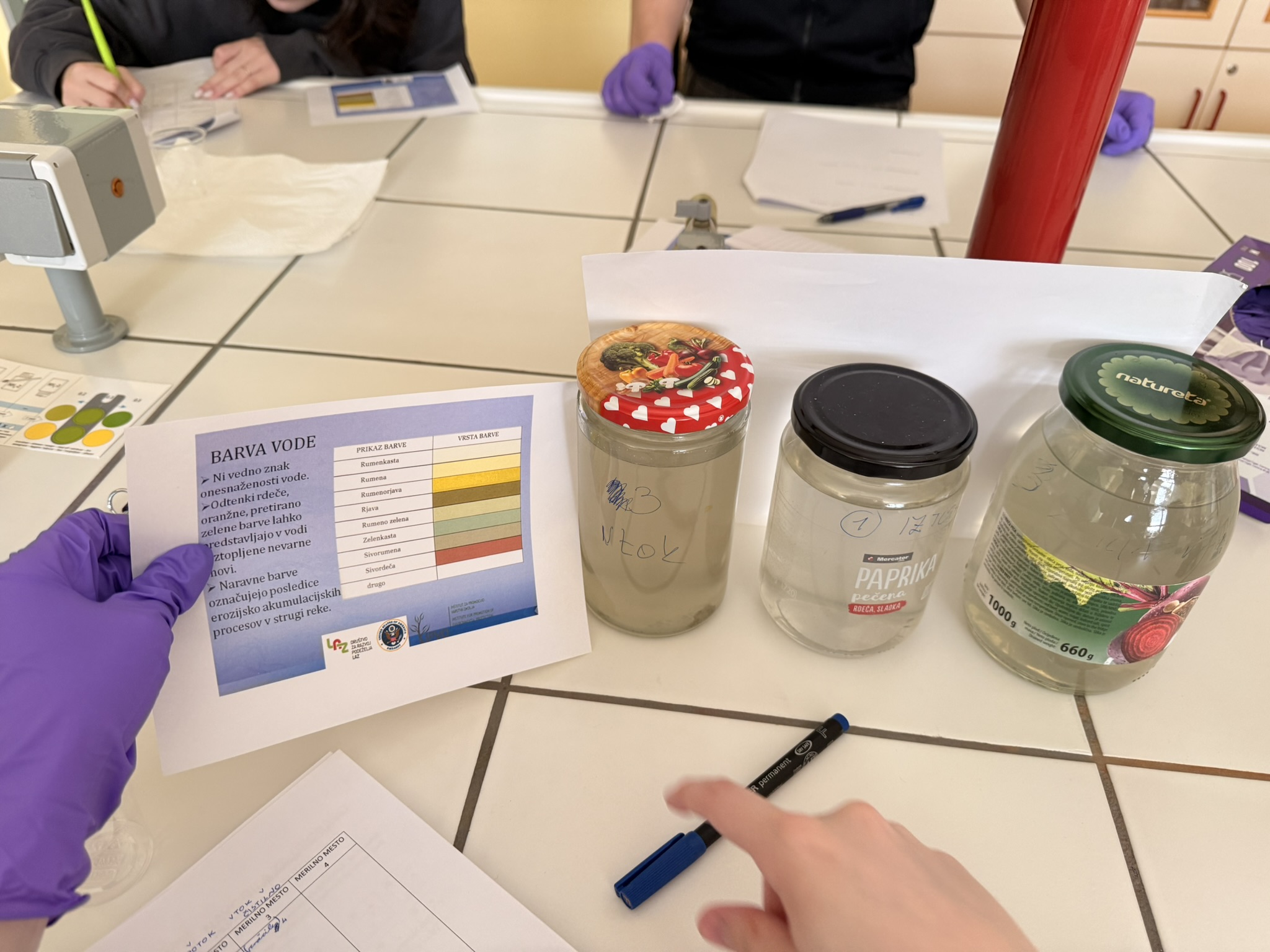 Določevali smo trdoto vode, kisik, prevodnost, nitrite, nitrate, fosfate, amonijeve ione, pH ter temperaturo, barvo in vonj.